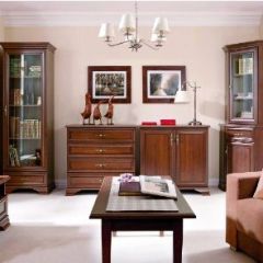 Кентаки - мебель классического стиля, отличающаяся природными цветами, отделкой фактурой, всегда актуально и востребована, она настолько универсальна, что без проблем впишется в любой современный дизайн. Стиль набора модульной мебели подчеркивается лакированной патинированной планкой в фасадах, карнизами - завершающим акцентом в зеркалах и высоких элементах набора, витиеватыми ручками.