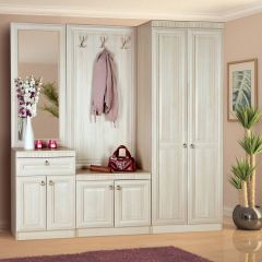 Серия включает все необходимые предметы мебели для прихожей: 1-, 2- дверные и угловой шкафы для одежды, тумба с панелью с крючками и тумба с зеркалом.